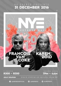 KAREN ZOID & FRANCOIS VAN COKE Hierdie jaar bring JBay Rocks 2016 die grootste nuwejaar partytjie wat ons nog ooit tevore gesien het: JBay NYE 2016/2017 met Karen Zoid & Francois van Coke hier by Jolly Dolphin! Tickets at Computicket